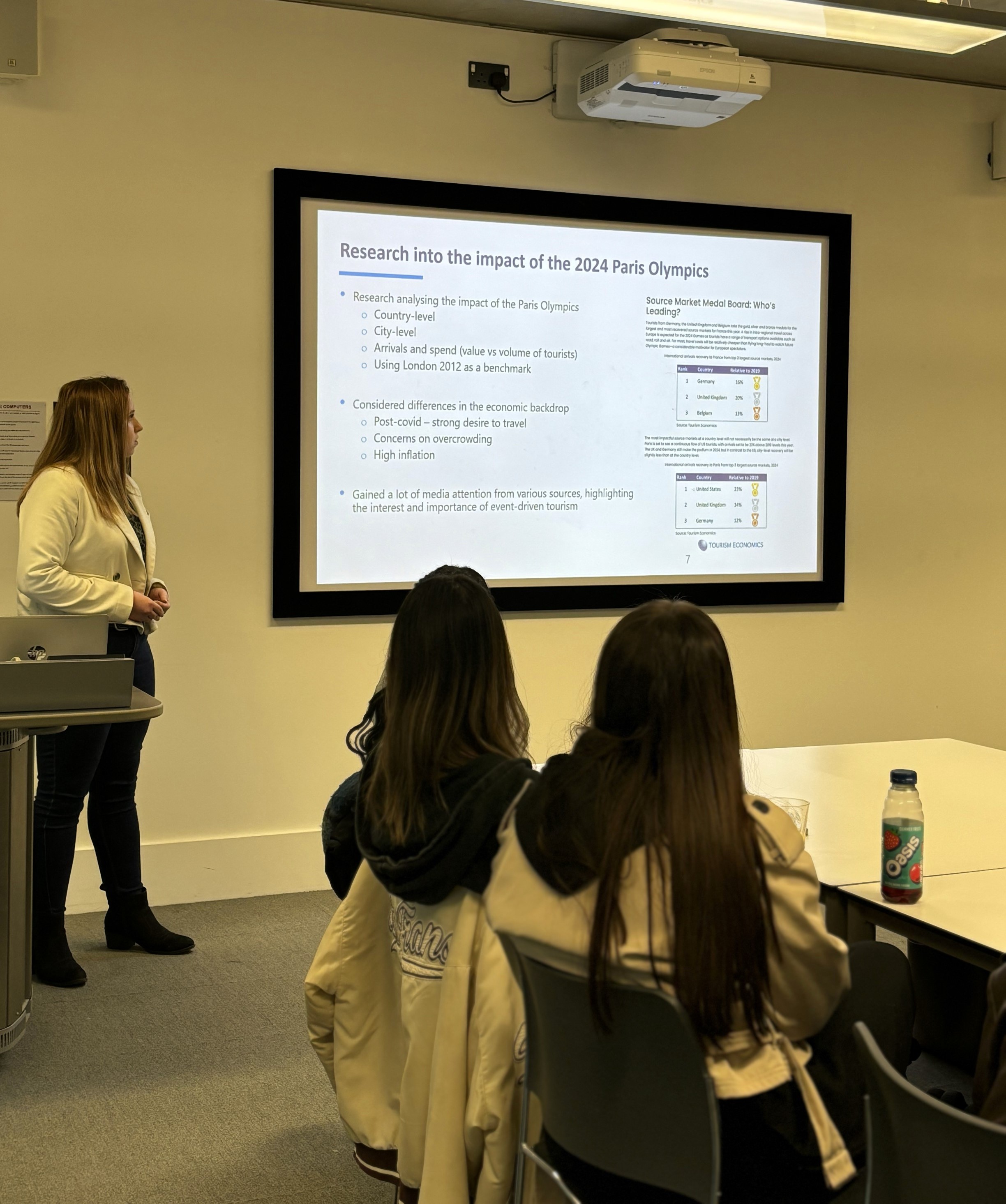 Chloe Parkins (Lead Economist Tourism, Oxford Economics) followed Lotta’s presentation and recalled her winding career path leading to economics while laying out the day-to-day responsibilities of an economist working in industry. Chloe discussed some of the reports she has been working on including the economic impact of the 2024 Paris Olympics and a long-haul travel analysis for the European Travel Commission. Chloe concluded by noting that, even if the utmost care is taken to give precise economics predictions, these forecasts may not always come true considering the unpredictability of future global events. She noted the geopolitical tensions and wars as a case in point.
