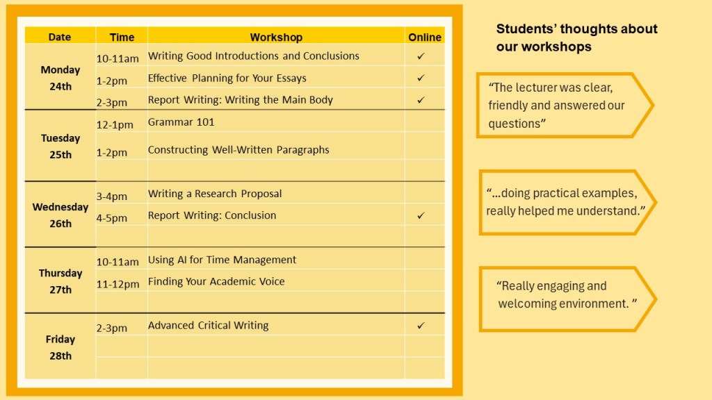 Please remember that the more academic skills you gain during your course, the better you will become over time. It will enhance all elements of your work including presentations, assignments, and even job applications.