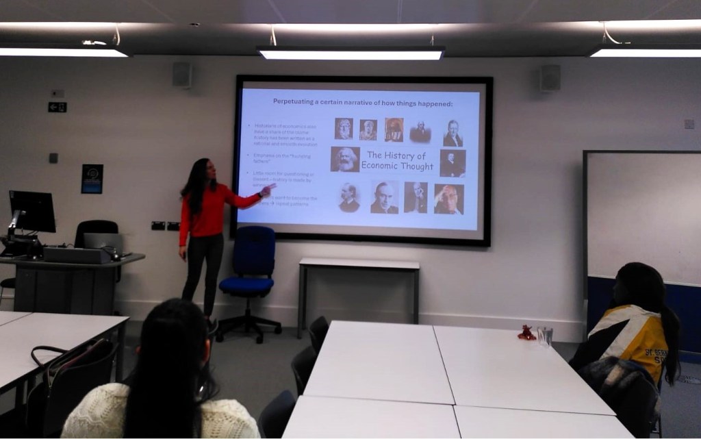 The third WEMS event welcomed Danielle Guizzo (Associate Professor in Economics Education, University of Bristol). Danielle presented research on “herstories”, or the lack thereof, within the economics discipline. The fact that attending female students and academics were not able to name three leading female economists was a case in point. The issue of missing(gender) diversity, in economics, among others, is an all-encompassing one, stretching across different schools of economic thought, time and space. It is deep-rooted in a discipline where the pursuit of specialization and scientific expertise has led to exclusionary structures and practices in the creation and dissemination of knowledge. With a focus on its “founding fathers”, economics as a whole has essentially deleted female economists and their contributions from the field.