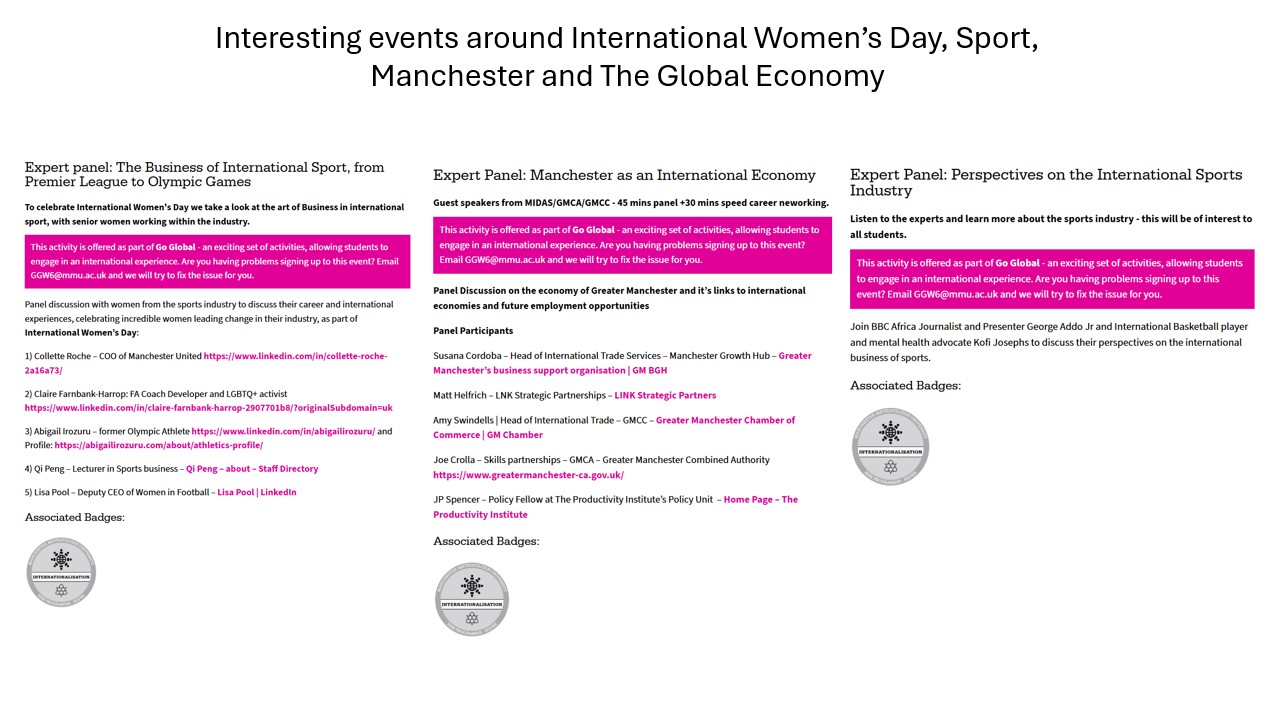 - https://rise.mmu.ac.uk/activity/expert-panel-the-business-of-international-sport-from-premier-league-to-olympic-games/ – A panel plus speed networking including the COO of Manchester United, Deputy CEO of Women in Football, A former Olympic Athlete, – Panel is around business of International Sport, and sporting perspectives on International Women’s Day